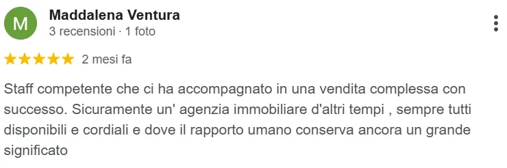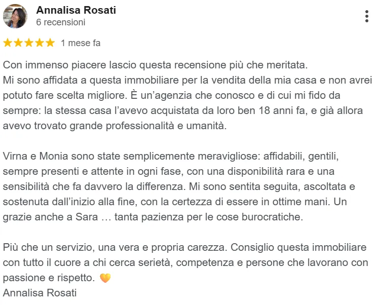 “Mi sono affidata a questa immobiliare per la vendita della mia casa e non avrei potuto fare scelta migliore… sempre presenti e attente in ogni fase, con una disponibilità rara e una sensibilità che fa davvero la differenza”