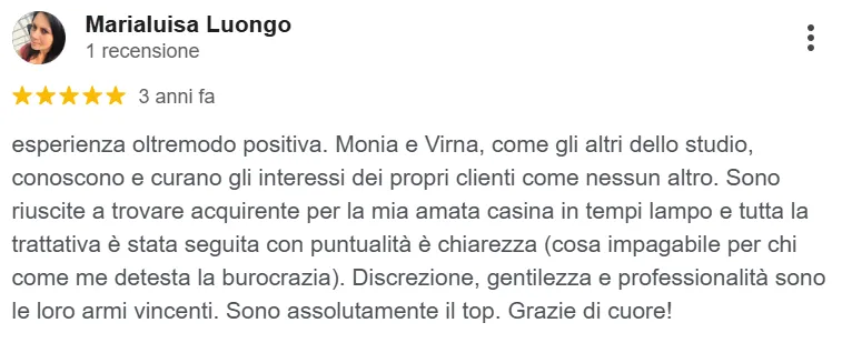 “Sono riuscite a trovare acquirenti per la mia amata casina in tempi lampo e tutta la trattativa è stata seguita con puntualità e chiarezza”